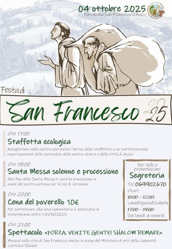 La Parrocchia e la comunità di Cerenova si preparano a vivere un momento di grande partecipazione collettiva in occasione della festa di San Francesco d’Assisi, patrono d’Italia. Quest’anno la ricorrenza assume un significato ancora più profondo, legato a un messaggio di pace e speranza, valori di cui il mondo avverte oggi più che mai la necessità. L’appuntamento è fissato per sabato 4 ottobre, con un pomeriggio scandito da eventi che uniscono spiritualità, tradizione e condivisione. Il programma della giornata prevede alle 17:00 l’arrivo della Staffetta Ecologica, iniziativa simbolica che attraverserà diverse comunità parrocchiali per diffondere un messaggio di unità e vicinanza. A seguire, alle 18:00, la celebrazione della Santa Messa e la processione per le vie di Cerenova, arricchita dalla presenza del Gruppo Bandistico Cerite, che accompagnerà fedeli e cittadini lungo il percorso. Un’occasione di preghiera ma anche di comunità, che rinnova i valori francescani di fraternità, semplicità e amore per il creato, rendendo la festa di San Francesco un appuntamento sentito e partecipato da tutta Cerenova.