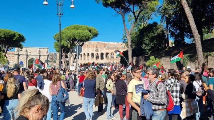 È una marea umana quella che ha attraversato Roma. La manifestazione nazionale per la Palestina ha riunito studenti, sindacati, semplici cittadini: tutti in strada con le bandiere per la pace per chiedere lo stop al conflitto in Medioriente e per solidarizzare con la missione della Global Sumud Flotilla. Una lunga bandiera della Palestina è stata srotolata a Porta San Paolo, a Roma, tra il camion e il cordone in testa al corteo per Gaza che percorre le vie della città, da piazzale Ostiense a San Giovanni. Tantissimi dei partecipanti indossano la kefiah, ci sono cartelloni e striscioni, lo slogan è “Stop al genocidio, fermiamo il sionismo con la resistenza”. “Stop genocide”, “free Palestine”, scandiscono i diversi gruppi, qualcuno accompagnato dalle percussioni. “I bambini palestinesi hanno paura dell’Idf, l’Idf ha paura dei biscotti”, si legge poi su uno dei tanti cartelli in piazza. Mentre su un altro: “A Gaza niente weekend lungo, pranzo con i nonni, pastarelle”. La situazione viene seguita con la massima attenzione dalle forze dell’ordine. Controlli anche ai caselli: intercettati dalla polizia manifestanti con maschere antigas, caschi e aste di legno. Nella zona del parco del Colle Oppio cinque minorenni, provenienti da Pisa, sono stati identificati dalla Polizia di Stato. Sequestrati caschi, fumogeni, bottiglie in vetro e bombolette spray. “Siamo un milione”, affermano gli organizzatori, mentre le forze dell’ordine parlano di 300 mila partecipanti. Presenti delegazioni delle associazioni culturali, sindacati di base, attivisti e gruppi studenteschi provenienti da tutto il Paese. Momenti di tensione al corteo quando un gruppo di manifestanti si è staccato dal percorso, all’altezza di via Mecenate, per andare verso via Merulana e arrivare a Santa Maria Maggiore. I manifestanti, dietro uno striscione che recita ‘Blocchiamo tutto’, hanno lanciato petardi e bottiglie contro le forze dell’ordine. La polizia ha fronteggiato i manifestanti con lacrimogeni e idranti, isolando il gruppo proprio accanto alla storica basilica romana. I poliziotti in tenuta anti sommossa con i manganelli in mano verso San Giovanni, dov’è il cuore della manifestazione pro-Pal a Roma. Negli scontri tra manifestanti e polizia a Santa Maria Maggiore una ragazza è rimasta ferita, medicata sul posto e poi portata via in ambulanza. Più di duecentocinquanta fermati e identificati. Per tutti sarà valutato il deferimento per reati di daneggiamento, adunata sediziosa e resistanza a pubblico ufficiale. Il bilancio è di due autovetture e diversi cassonetti dati alle fiamme.