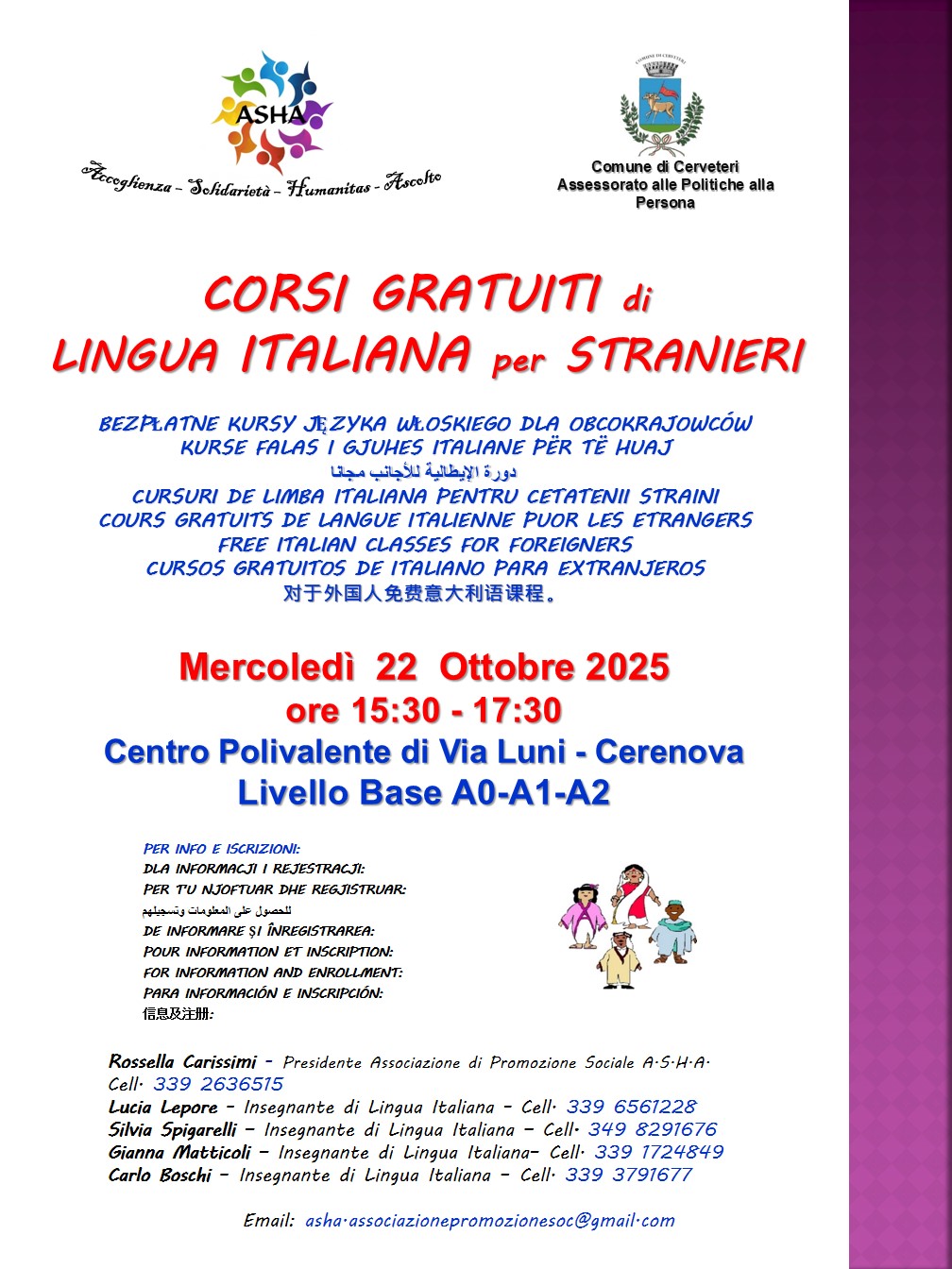 Accoglienza, solidarietà, humanitas e ascolto: questi sono i pilastri dell’iniziativa promossa dall’Associazione A.S.H.A. (Associazione di Promozione Sociale), in collaborazione con l’Assessorato alle Politiche Sociali del Comune di Cerveteri. Dopo il successo delle precedenti edizioni, torna l’appuntamento con i Corsi Gratuiti di Lingua Italiana per Stranieri, rivolti a chi desidera migliorare l’integrazione nel territorio e nella vita quotidiana. L’obiettivo del progetto è chiaro: offrire agli stranieri uno strumento fondamentale per la vita sociale, lavorativa e personale nel nostro Paese, favorendo inclusione e partecipazione attiva alla comunità. Il nuovo ciclo di lezioni, dedicato al Livello Base (A0-A1-A2), prenderà il via mercoledì 22 ottobre 2025. Le lezioni si terranno presso il Centro Polivalente di Via Luni a Cerenova, con orario 15:30 – 17:30. Le iscrizioni sono già aperte e rappresentano un’opportunità concreta per chi desidera acquisire competenze linguistiche indispensabili per orientarsi nella vita quotidiana e nelle attività lavorative, partecipando attivamente alla vita della comunità di Cerveteri. L’iniziativa conferma l’impegno dell’associazione A.S.H.A. e del Comune nel promuovere accoglienza, integrazione e solidarietà, valori fondamentali per costruire una società inclusiva e coesa.