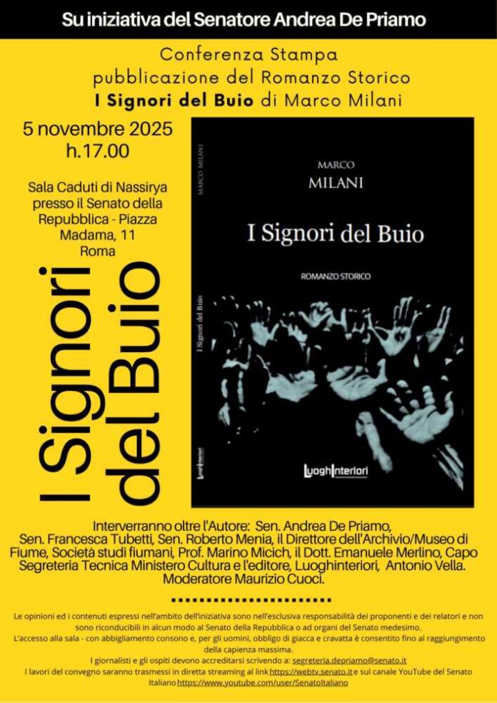 Mercoledì 5 novembre 2025, alle ore 17, nella Sala Caduti di Nassirya del Senato della Repubblica, si terrà la conferenza stampa per la presentazione del romanzo storico I Signori del Buio, opera di Marco Milani che affronta il dramma delle Foibe e degli esuli istriani, giuliani e dalmati attraverso la narrativa, rendendo la vicenda accessibile a un pubblico ampio. L’iniziativa, promossa su impulso del Senatore Andrea De Priamo, vuole sottolineare l’importanza storica del libro, scegliendo un contesto istituzionale per valorizzarne il messaggio. Alla presentazione prenderanno parte, oltre all’autore, figure istituzionali e politiche, tra cui i Senatori Andrea De Priamo e Francesca Tubetti, il Direttore dell’Archivio-Museo di Fiume e Società Studi Fiumani, Prof. Marino Micich, il Capo della Segreteria Tecnica del Ministero della Cultura, Dott. Emanuele Merlino, e l’editore Antonio Vella di Luoghinteriori Edizioni. La conferenza sarà moderata da Maurizio Cuoci. Marco Milani, già noto al pubblico per il successo del romanzo storico L’Inverno del Pesco in Fiore (2016), con questa nuova opera offre una narrazione che intreccia fatti storici documentati e vicende personali, permettendo al lettore di comprendere le drammatiche vicende degli esuli adriatici e la memoria di un periodo spesso poco conosciuto. La scelta di presentare il libro in un contesto istituzionale come il Senato vuole dare ulteriore rilievo alla tematica storica e culturale trattata, ponendo l’accento sull’importanza della memoria e del racconto come strumenti di educazione civica e storica.