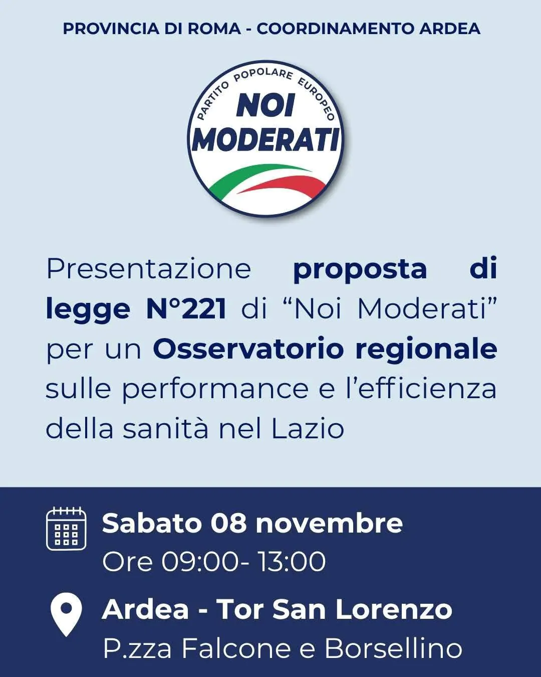 L’iniziativa vuole coinvolgere cittadini e famiglie su un tema particolarmente sensibile per il territorio: la qualità dei servizi sanitari e la necessità di monitorarli in modo costante e trasparente. «Questa raccolta firme nasce per favorire il miglioramento continuo della qualità, dell’equità e dell’efficienza dei servizi sanitari, nel rispetto dei diritti dei cittadini» ha dichiarato William Spina, vicecoordinatore di Noi Moderati Ardea. Il gazebo fornirà materiale informativo e sarà possibile aderire direttamente alla sottoscrizione della proposta di legge. L’obiettivo, spiegano gli organizzatori, è avviare un percorso di partecipazione civica che permetta alla Regione Lazio di dotarsi di uno strumento di controllo e valutazione capace di evidenziare criticità e punti di forza del sistema sanitario regionale. L’appuntamento di domani rappresenta una delle tappe della campagna promossa da Noi Moderati nei Comuni del litorale, nell’intento di ampliare il dibattito pubblico e sensibilizzare la popolazione sul diritto a una sanità efficiente e accessibile.