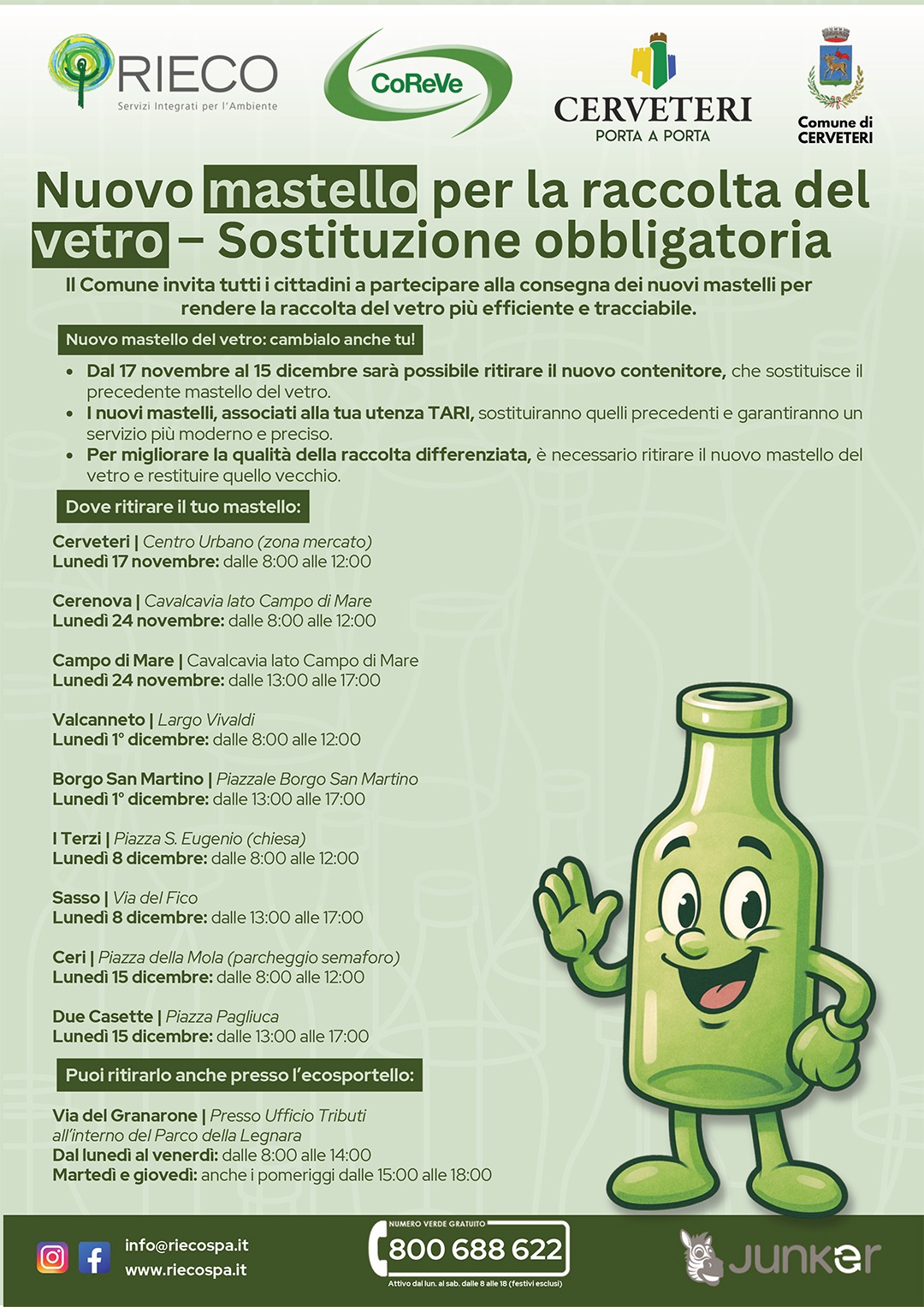 Parte una nuova e importante iniziativa per modernizzare e rendere più efficiente il servizio di raccolta differenziata del vetro. Dal 17 novembre al 15 dicembre, tutti i cittadini sono invitati a ritirare il nuovo mastello dedicato al vetro, che andrà a sostituire obbligatoriamente il contenitore attuale. L’iniziativa, promossa in collaborazione con Rieco Spa e CoReVe (Consorzio Recupero Vetro), ha come obiettivo quello di migliorare la qualità e la tracciabilità del materiale raccolto, garantendo un sistema più sostenibile e allineato agli standard ambientali più avanzati. Un elemento di novità è rappresentato dai mastelli associati direttamente all’utenza TARI: ogni contenitore sarà infatti personalizzato e collegato all’intestatario dell’utenza, consentendo una gestione più precisa e un monitoraggio puntuale del servizio. Durante il ritiro del nuovo contenitore sarà necessario restituire il vecchio mastello, così da completare la sostituzione in modo corretto e ordinato. Per garantire a tutti i cittadini la possibilità di ritirare il nuovo mastello senza disagi, sono stati predisposti diversi punti di distribuzione sul territorio, ciascuno con un calendario specifico che sarà comunicato nei prossimi giorni attraverso i canali ufficiali del Comune e di Rieco Spa. Con questa iniziativa, l’amministrazione comunale compie un ulteriore passo avanti verso una raccolta differenziata più moderna, efficiente e rispettosa dell’ambiente, puntando su responsabilità condivisa e innovazione tecnologica.