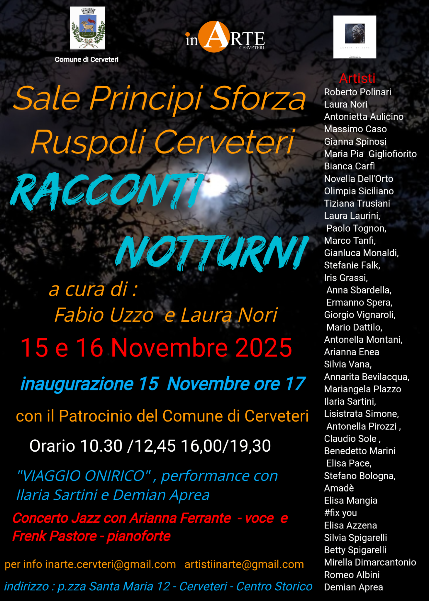 La notte diventa protagonista assoluta a Cerveteri con la nuova mostra collettiva “Racconti Notturni”, un percorso immersivo tra ombre, luci e atmosfere notturne, ospitato nelle storiche Sale Ruspoli. L’esposizione, a ingresso libero, riunisce quarantuno artisti che interpretano il tema della notte attraverso pittura, fotografia e scultura, trasformando l’oscurità in un terreno di esplorazione emotiva e creativa. Il progetto nasce come un omaggio ai grandi capolavori della storia dell’arte, con la celebre Notte Stellata di Van Gogh a fare da riferimento simbolico per una riflessione sull’inconscio, i sogni e le visioni oniriche. Le opere esposte guidano il visitatore in un viaggio tra paesaggi lunari, desideri, paure e confessioni intime, raccontando la notte come specchio dell’anima e dell’inconscio umano. La mostra è frutto di una collaborazione tra l’associazione culturale inArte di Cerveteri e Artisti in Arte di Castelnuovo di Porto, con l’obiettivo di valorizzare il territorio e creare una rete culturale condivisa, rendendo l’arte accessibile e momento di incontro per la comunità. Il vernissage si terrà sabato 14 novembre e sarà arricchito da eventi performativi: il testo teatrale “Viaggio Onirico”, scritto e interpretato da Ilaria Sartini, sarà accompagnato dalle note al pianoforte e violino elettrico di Antonio Demian Aprea, mentre a seguire il duo jazz Arianna Ferrante (voce) e Frenk Pastore (pianoforte) proporrà un concerto di standard jazz. Gli organizzatori invitano tutti a partecipare a questa esperienza unica, dove arte visiva, musica e narrazione si fondono per raccontare la magia e il mistero della notte, offrendo momenti di riflessione e bellezza aperti a grandi e piccoli.