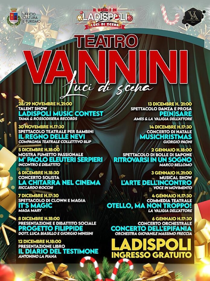 Dal 28 novembre al 6 gennaio, il Teatro Marco Vannini di Ladispoli ospiterà “Luci di Scena”, il tradizionale progetto natalizio a cura della Valigia dell’Attore, che trasforma la città in un palcoscenico di eventi culturali e artistici per tutte le età. La rassegna propone spettacoli teatrali, concerti, dibattiti e presentazioni di libri, tutti a ingresso gratuito, confermandosi come un appuntamento imperdibile nel calendario cittadino. L’iniziativa, ormai punto di riferimento della stagione natalizia, è resa possibile grazie all’impegno dell’Amministrazione comunale, che ha voluto offrire momenti di intrattenimento e partecipazione alla cittadinanza. Una vera e propria occasione per famiglie, giovani e appassionati di teatro e cultura di vivere la città tra luci, arte e atmosfere festive. Con “Luci di Scena”, Ladispoli inaugura così un percorso culturale che unisce tradizione e innovazione, offrendo al pubblico esperienze variegate e coinvolgenti, in un clima di festa e socialità.