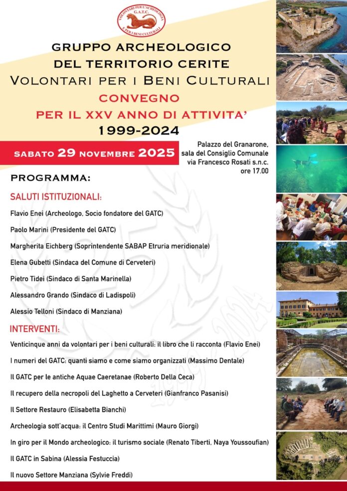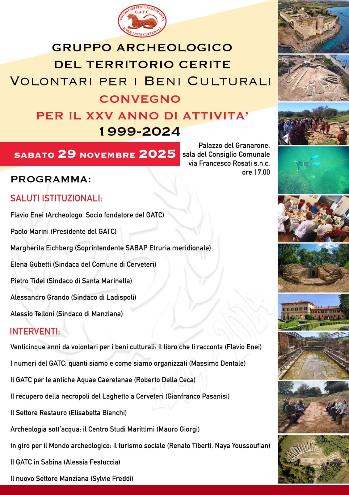 Un quarto di secolo dedicato alla tutela e alla valorizzazione del patrimonio archeologico del territorio. È questo l’importante traguardo raggiunto dal Gruppo Archeologico del Territorio Cerite (GATC), realtà che da 25 anni opera instancabilmente tra ricerca, recupero e divulgazione culturale nell’area cerite e nei comuni limitrofi. Per celebrare le “nozze d’argento” con il volontariato archeologico, il GATC ha organizzato un convegno che si terrà domani, sabato 29 novembre, alle ore 17:00, nell’Aula Consiliare del Palazzo del Granarone di Cerveteri. Un appuntamento che vuole essere non solo un momento di festa, ma anche un’occasione per ripercorrere i progetti e i risultati raggiunti nel corso degli anni. Durante l’incontro sarà presentato ufficialmente il volume che racconta la storia del gruppo e le tappe più significative di questo lungo percorso. A moderare l’evento sarà Francesca Romana Appetiti. La celebrazione vedrà la presenza delle istituzioni del territorio, a testimonianza del ruolo fondamentale che il GATC svolge nella tutela dei beni archeologici locali.  Il convegno è aperto a tutti i cittadini, agli appassionati e ai curiosi. Un’occasione per conoscere da vicino chi, da 25 anni, dedica tempo e competenze alla salvaguardia della storia del territorio, contribuendo a costruire una memoria collettiva più consapevole e condivisa.