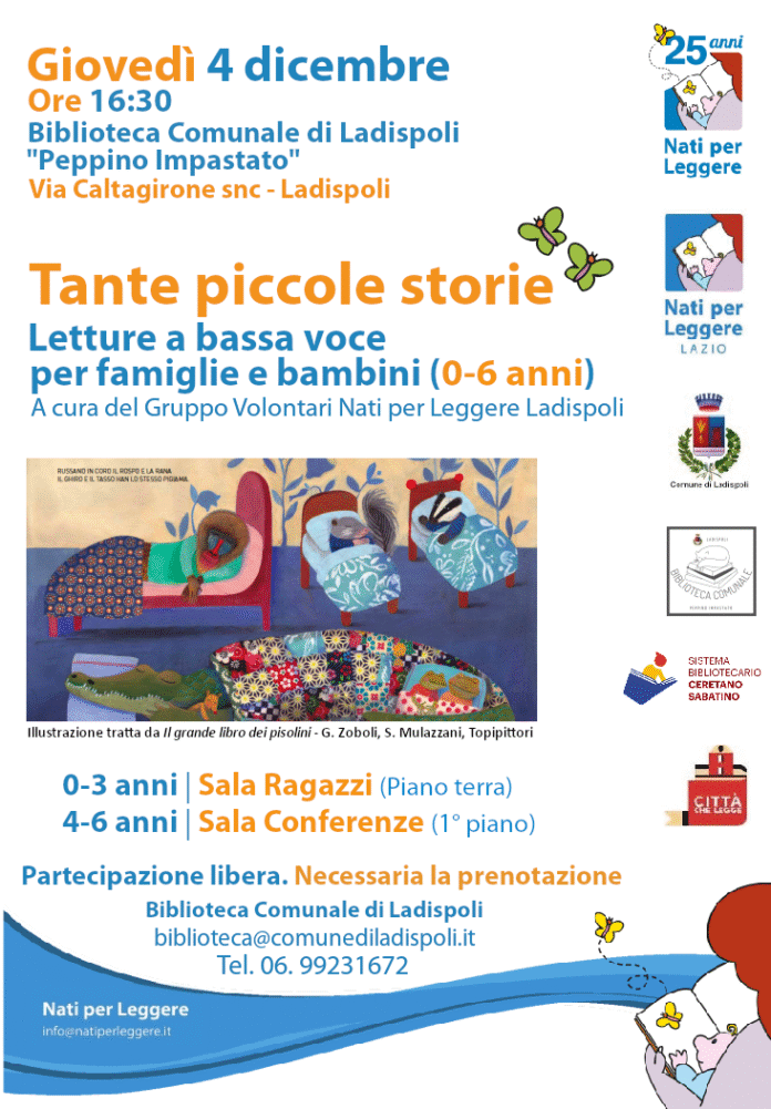 A guidare le sessioni sarà l’instancabile Gruppo Volontari Nati per Leggere di Ladispoli, che con passione e competenza accompagnerà i bambini tra fiabe, storie e racconti a bassa voce, favorendo lo sviluppo dell’immaginazione, del linguaggio e dell’amore per la lettura.