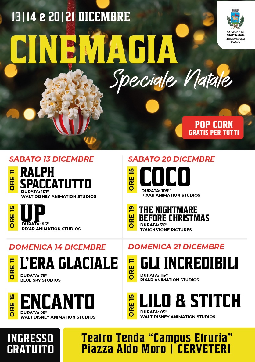 La magia del cinema accende il Natale di Cerveteri. Al Teatro Tenda “Campus Etruria” di Piazza Aldo Moro prende il via “CineMagia – Speciale Natale”, una rassegna tutta dedicata a bambini e ragazzi con otto proiezioni gratuite dei film d’animazione più amati e più recenti usciti nelle sale. Un’iniziativa pensata per le famiglie e per regalare ai più piccoli momenti di svago e condivisione durante le festività. Oltre all’ingresso libero per tutti, l’appuntamento avrà un ulteriore tocco di festa: popcorn gratuiti distribuiti durante ogni proiezione. La programmazione — che spazia dalle avventure ai classici moderni del cinema d’animazione — mira a trasformare il Teatro Tenda in un vero villaggio del cinema natalizio, dove il grande schermo diventa un luogo d’incontro per la comunità. Con CineMagia, Cerveteri scommette sulla cultura e sul divertimento per i più piccoli, offrendo un calendario di appuntamenti che promette di incantare famiglie e bambini fino all’ultima proiezione.