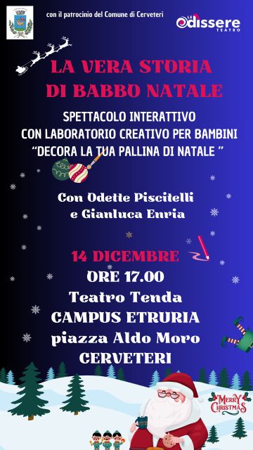 Sarà il Teatro Tenda “Campus Etruria” di piazza Aldo Moro a ospitare, domenica 14 dicembre alle ore 17.00, il primo dei due appuntamenti dedicati agli spettacoli interattivi per bambini inseriti nel cartellone del Natale Cerite 2025. L’iniziativa, organizzata da Le Odìssere Teatro e patrocinata dal Comune di Cerveteri, punta a regalare ai più piccoli un’esperienza immersiva capace di coniugare teatro, creatività e magia natalizia. Il debutto è affidato a “La vera storia di Babbo Natale”, uno spettacolo pensato per coinvolgere attivamente bambine e bambini, trasformandoli da semplici spettatori a veri protagonisti della narrazione. Un viaggio fantastico che li condurrà fino al Polo Nord, alla scoperta delle origini di Babbo Natale, guidati dall’elfa Caramella. Durante l’avventura i piccoli incontreranno Nicholas, il falegname che costruiva giocattoli per tutti i bambini del villaggio, e prenderanno parte alla sua straordinaria avventura che lo porterà nel paese degli Elfi, dove avverrà la Magia di Tutti i Tempi. Il racconto teatrale si intreccia con momenti laboratoriali, creativi e ludici: i bambini faranno tappa nel laboratorio degli Elfi, dove potranno decorare la propria pallina di Natale e scrivere una letterina da consegnare personalmente a Babbo Natale, rendendo l’esperienza ancora più coinvolgente ed emozionante. In scena Odette Piscitelli e Gianluca Enria, che accompagneranno i giovani spettatori anche nello svolgimento del laboratorio creativo, offrendo un pomeriggio all’insegna della fantasia e della partecipazione attiva. Il secondo appuntamento è in programma domenica 21 dicembre, con “Aladino e la lampada meravigliosa”, che andrà in scena alla Sala Ruspoli di piazza Santa Maria, completando così il doppio percorso teatrale dedicato all’infanzia. L’ingresso è gratuito, con età consigliata dai 3 agli 11 anni. Per i bambini più piccoli è richiesta la presenza di un genitore, al fine di facilitare lo svolgimento delle attività. «La vera storia di Babbo Natale» si conferma così un’esperienza unica che unisce teatro, musica e bricolage, offrendo ai più piccoli l’opportunità di vivere la magia del Natale in modo originale e indimenticabile. Un progetto che rispecchia la filosofia di Le Odìssere Teatro, compagnia attiva nella produzione di spettacoli, percorsi formativi, festival e progetti culturali in sinergia con il territorio del Lazio e con il Comune di Cerveteri.