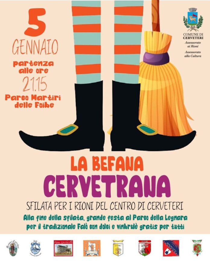 tradizionale “Befana Cervetrana”. L’iniziativa, organizzata dai Massari Ceretani insieme ai sette Rioni cittadini e con il sostegno degli Assessorati ai Rapporti con i Rioni e alla Cultura del Comune di Cerveteri, si prepara a regalare una giornata di festa, colori e tradizione. Lunedì 5 gennaio, la simpatica vecchina sfilerà lungo le strade della città, attraversando tutti i luoghi simbolo dei Rioni ceretani. Il corteo prenderà il via dal parco di via Martiri delle Foibe, nel Rione Fontana Morella, per poi proseguire verso la Quercia di Madonna dei Canneti, il piazzale della Fornace, le piazze di Casaccia e San Pietro, fino a raggiungere il Centro Storico della Boccetta e il Rione Garbatella. Un percorso animato da musica, campanacci, balli e lanci di dolciumi, che coinvolgerà grandi e piccoli in un clima di allegria e condivisione. Gran finale al Parco della Legnara, dove la Befana farà il suo ingresso tra gli applausi e dove sarà acceso il tradizionale e beneaugurale falò dell’Epifania, momento simbolico che chiude le festività natalizie e rinnova un rito caro alla cultura e alla storia della città.