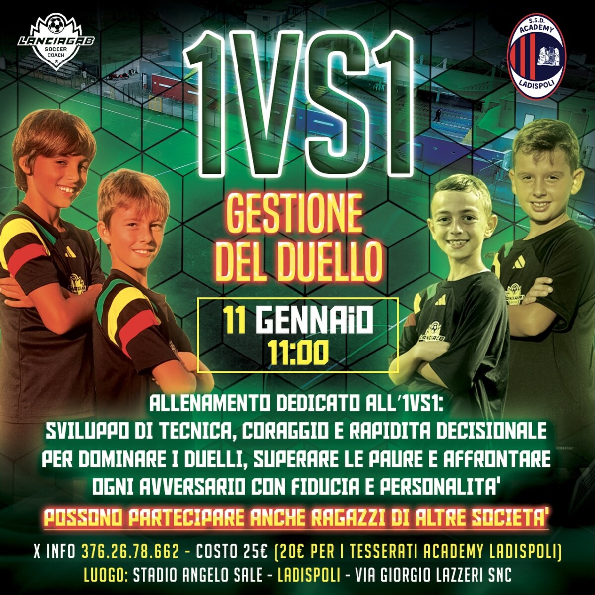 Un’occasione imperdibile per crescere, migliorare e fare davvero la differenza sul campo. Domenica 11 gennaio, a partire dalle ore 11:00, lo Stadio Angelo Sale di Ladispoli ospiterà il secondo appuntamento della Masterclass 1vs1, una mattinata di allenamento intensivo dedicata al perfezionamento del duello individuale palla al piede. A guidare la sessione sarà mister Gabriele Lancianese, tecnico qualificato UEFA B, pronto a mettere a disposizione dei partecipanti competenze ed esperienza maturate sul campo. Il focus dell’allenamento sarà sulla gestione dell’uno contro uno, uno degli aspetti più determinanti del calcio moderno: tecnica individuale, rapidità decisionale, capacità di leggere le situazioni di gioco e di superare l’avversario diretto. La Masterclass è aperta a tutti, non solo agli atleti dell’Academy Ladispoli, ma anche a ragazzi appartenenti ad altre società, confermando la volontà di creare un momento formativo di alto livello e condiviso. I posti disponibili sono limitati e restano ancora pochissime disponibilità per prendere parte all’iniziativa. Il costo della lezione è di 25 euro, con una tariffa agevolata di 20 euro per i tesserati dell’Academy Ladispoli. Per informazioni e prenotazioni è possibile contattare il numero 376 2678662. Un appuntamento pensato per chi vuole migliorarsi, mettersi alla prova e vivere un’esperienza di calcio formativa e stimolante, sotto la guida di uno staff qualificato e in una cornice d’eccezione come lo stadio Sale di Ladispoli.