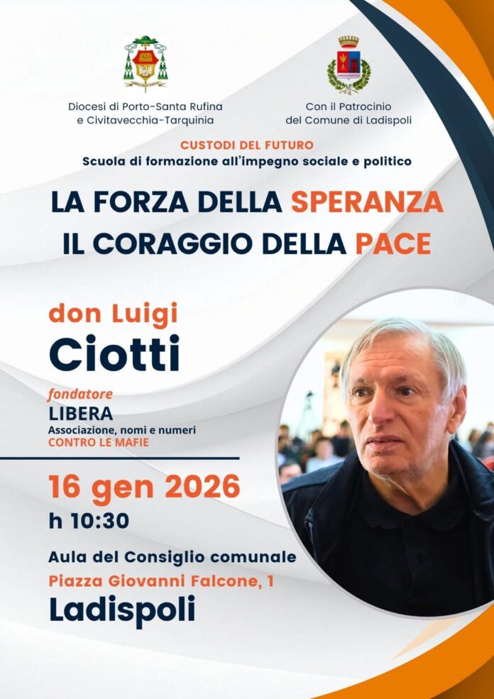 Venerdì prossimo Ladispoli sarà al centro di un importante momento di riflessione sociale e culturale. La città ospiterà don Luigi Ciotti, fondatore di Libera e del Gruppo Abele, per un incontro pubblico che si inserisce nel programma della scuola interdiocesana di formazione all’impegno sociale e politico, “Custodi del Futuro”. L’evento, promosso congiuntamente dalle Diocesi di Porto-Santa Rufina e Civitavecchia-Tarquinia e con il patrocinio del Comune di Ladispoli, punta a coinvolgere cittadini, studenti e realtà del territorio in un dialogo sui temi della legalità, della giustizia sociale e dell’impegno civile. Don Ciotti, da anni punto di riferimento nazionale per la lotta alle mafie e alle ingiustizie sociali, porterà la sua esperienza e le sue riflessioni, stimolando la partecipazione attiva della comunità. “Custodi del Futuro” rappresenta un’occasione unica per confrontarsi con le sfide della società contemporanea e approfondire il ruolo dei cittadini nella costruzione di un mondo più equo e solidale. La scelta di Ladispoli come sede dell’incontro sottolinea l’attenzione della città verso iniziative culturali e formative di rilevanza nazionale, capaci di unire formazione, impegno sociale e dialogo pubblico. L’appuntamento, che si preannuncia partecipato, sarà non solo un momento di ascolto e confronto, ma anche un’occasione per rafforzare la coscienza civica e il senso di comunità tra i cittadini di Ladispoli e dei comuni limitrofi.