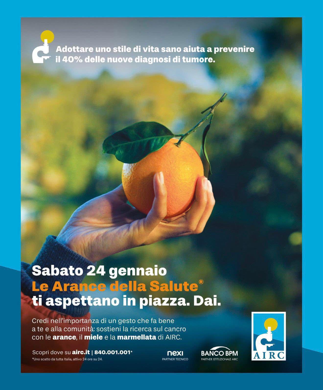 Come da tradizione, tornano in tutta Italia le “Arance della Salute” di AIRC, la storica iniziativa di raccolta fondi a favore della ricerca scientifica sul cancro promossa dalla Fondazione AIRC per la Ricerca sul Cancro. Un appuntamento ormai simbolo di impegno civile e solidarietà che anche quest’anno farà tappa a Cerveteri, dove sabato 24 gennaio Piazza Aldo Moro si trasformerà in un punto d’incontro tra cittadini, volontari e sostenitori della ricerca. A rappresentare AIRC sul territorio ci sarà, come sempre, Bruno Frosi, affiancato dai volontari di Assovoce, presenza costante e instancabile nelle principali iniziative solidali della città. I banchetti delle “Arance della Salute” offriranno l’opportunità di contribuire concretamente alla lotta contro il cancro attraverso una donazione, ricevendo in cambio le tradizionali arance, simbolo di prevenzione, salute e speranza. L’iniziativa, che ogni anno coinvolge migliaia di piazze italiane, non è soltanto una raccolta fondi, ma anche un’occasione di sensibilizzazione sull’importanza della prevenzione e della ricerca scientifica. Grazie al sostegno dei cittadini, AIRC finanzia progetti di altissimo livello, sostenendo il lavoro di ricercatori e ricercatrici impegnati ogni giorno nello studio delle cause, della diagnosi e delle cure oncologiche. La presenza delle “Arance della Salute” a Cerveteri conferma ancora una volta il forte legame della comunità etrusca con il mondo  del volontariato e della solidarietà. Un piccolo gesto, una donazione, possono fare la differenza e contribuire a trasformare la speranza in risultati concreti per la salute di tutti.