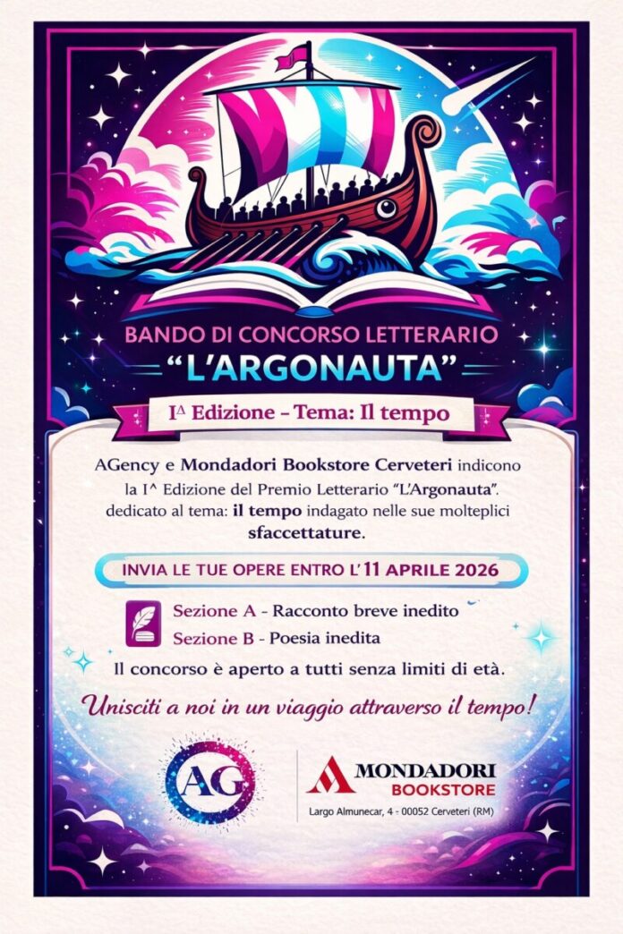 Cerveteri apre le porte alla creatività e alla passione per la scrittura. Dalla collaborazione tra Agency e la libreria Mondadori Bookstore Cerveteri nasce la prima edizione del Concorso Letterario “L’Argonauta”, un’iniziativa culturale rivolta a scrittori e appassionati di letteratura di ogni età. Il concorso si propone come un vero e proprio viaggio attraverso le parole, invitando i partecipanti a esplorare, raccontare e interpretare ciò che siamo e ciò che diventiamo. Un percorso simbolico che richiama il mito dell’Argonauta, emblema di scoperta, cambiamento e ricerca, declinato in chiave letteraria e contemporanea. L’obiettivo dell’iniziativa è quello di valorizzare il talento narrativo, promuovere la scrittura come strumento di espressione personale e favorire momenti di incontro e confronto tra autori, lettori e operatori culturali. Un progetto che rafforza il ruolo di Cerveteri come punto di riferimento per la promozione culturale sul territorio. Il Concorso Letterario “L’Argonauta” rappresenta così una nuova occasione per dare voce alla creatività, offrendo uno spazio aperto e inclusivo a chi desidera mettersi in gioco e condividere la propria visione del mondo attraverso la letteratura.