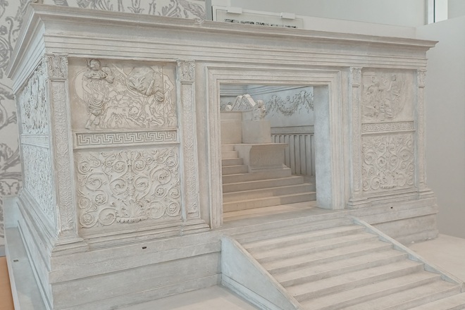 Uno degli altari più grandi al mondo: l’Ara Pacis, conservato in un museo che è esso stesso un capolavoro architettonico, capace di ospitare al suo interno esposizioni d’arte internazionale: è in corso fino al 3 maggio la mostra “Impressionismo e oltre. Capolavori dal Detroit Institute of Arts”. Tutto questo è il Museo dell’Ara Pacis , curato dalla Sovrintendenza di Roma Capitale. Un luogo unico dove l’archeologia sposa l’architettura contemporanea. L’Ara Pacis, realizzata in onore dell’imperatore Augusto, è custodita nel padiglione principale del Museo. Posto tra via di Ripetta e il Lungotevere, l’altare si trova in uno spazio che comunica con la città e il fiume attraverso grandi vetrate trasparenti. All’interno la luce omogenea, filtrata dai cristalli delle vetrate e dai lucernari valorizza i preziosi bassorilievi. L’ambiente, isolato acusticamente, protegge il monumento dagli agenti inquinanti mantenendo umidità e temperatura costanti. L’altare fu commissionato dal Senato romano nel 13 a.C. per celebrare la Pax Augustea. Eretto al termine di campagne militari, esalta la pace, l’abbondanza, la prosperità e la stabilità che Roma ha ritrovato grazie ad Augusto, dopo decenni di conflitti. ’Ara è uno degli esempi più alti dell’arte classica. Un capolavoro di intaglio a bassorilievo che sulle facciate esterne racconta storie di dinastie e fondazioni. Le figure, circa 80, intagliate sul marmo di Carrara sono quelle dei gemelli Romolo e Remo, di Enea giunto sulle sponde del Lazio con il figlio Julo. Sul lato destro, una sfilata di magistrati e sacerdoti tra i quali lo stesso Augusto con i suoi familiari.