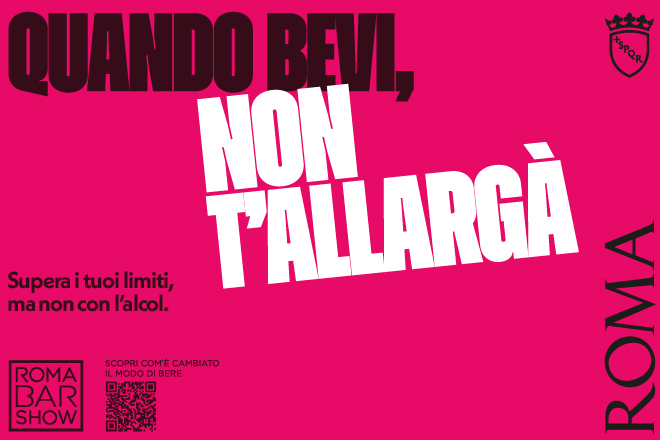 “Supera i tuoi limiti, ma non con l’alcol. Quando bevi, non t’allargà”, “Con gli alcolici non vale il DAJE FORTE”. Slogan diretti, efficaci ed indirizzati ad una platea vasta, di ogni età. È la campagna istituzionale di sensibilizzazione sociale per le buone pratiche sul consumo di alcolici e sui corretti comportamenti da adottare per garantire la propria sicurezza e quella degli altri. La realizzazione creativa e grafica è offerta come legacy alla città, grazie al patrocinio dell’assessorato ai Grandi Eventi, Sport Turismo e Moda, dagli organizzatori di “Roma Bar Show”: l’appuntamento internazionale che dal 2019 riunisce nella Capitale in un unico evento tutti gli attori dell’industria del beverage e il mondo della mixology italiana.