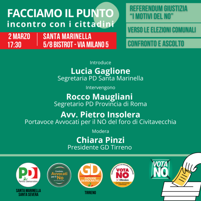 Il Partito Democratico di Santa Marinella e Santa Severa invita cittadini e cittadine a partecipare all’incontro pubblico intitolato “Facciamo il punto”, in programma lunedì 2 marzo 2026 alle ore 17:30 presso il 5/8 Bistrot in via Milano 5. L’evento si propone come un momento di approfondimento su due temi di grande rilevanza per la comunità e per il contesto nazionale. Il primo riguarda il referendum sulla riforma della giustizia, che si terrà il 22 e 23 marzo, con particolare attenzione ai motivi del No, spiegati dai rappresentanti del partito. Sarà un’occasione per chiarire ai cittadini i punti critici della legge costituzionale oggetto di voto e favorire un dibattito aperto e informato. Il secondo tema sarà il futuro amministrativo dei due comuni in vista delle elezioni del 24 e 25 maggio 2026. I partecipanti potranno confrontarsi sulle iniziative, i progetti e le strategie del Pd per lo sviluppo di Santa Marinella e Santa Severa, con particolare focus su servizi, infrastrutture e partecipazione civica. L’incontro si inserisce in un percorso di dialogo continuo tra il Partito Democratico e la cittadinanza, volto a favorire informazione, confronto e coinvolgimento diretto nelle scelte politiche locali e nazionali. Gli organizzatori invitano tutti i residenti a prendere parte all’appuntamento, sottolineando l’importanza della partecipazione attiva per il futuro della comunità.