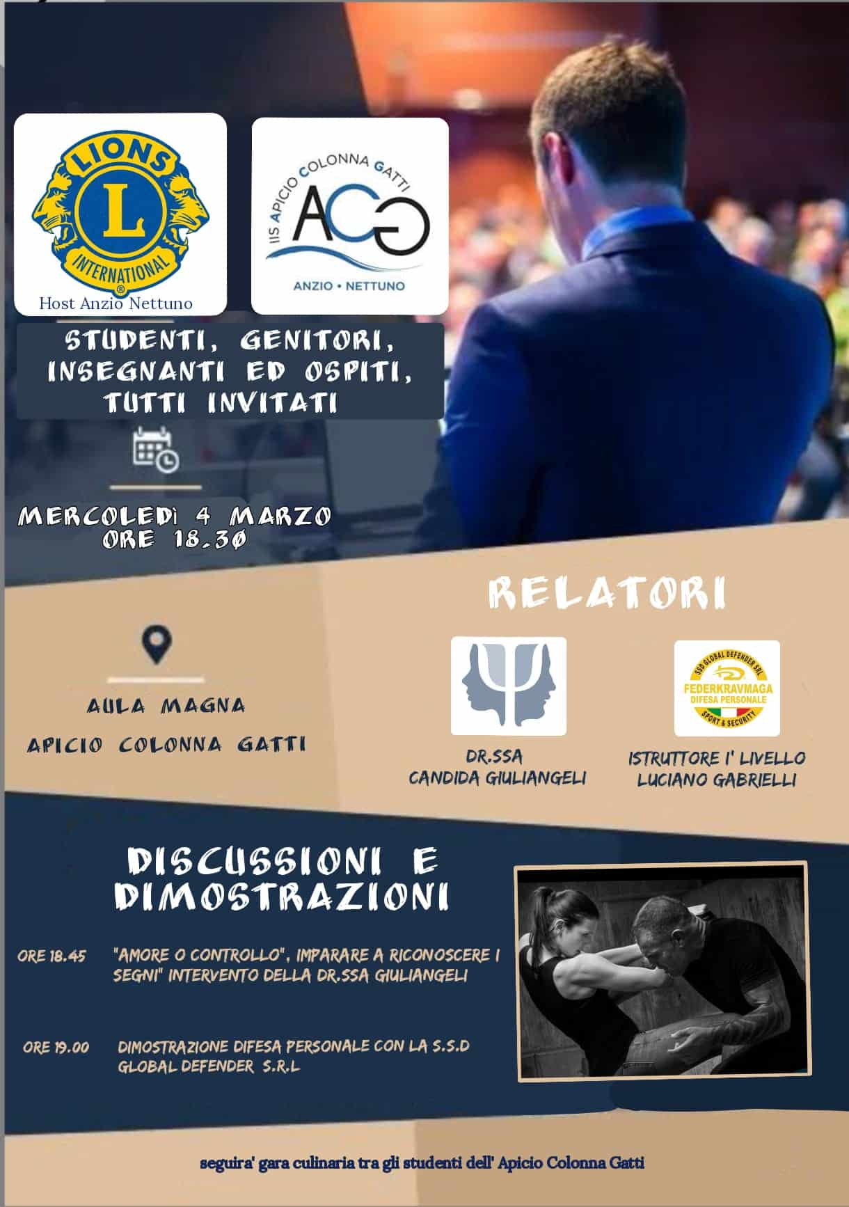 Il confine tra amore e possesso è spesso sottile, quasi invisibile, ma le sue conseguenze possono incidere in modo profondo sulla vita dei più giovani. Per rompere il silenzio e promuovere una cultura fondata sul rispetto e sulla consapevolezza, il Lions Club Anzio Nettuno Host e l’IIS Apicio Colonna Gatti hanno organizzato un workshop dal forte valore educativo e sociale. L’incontro si terrà il 4 marzo 2026, con inizio alle 18:30, presso l’Aula Magna dell’Istituto in Via Nerone 1, ad Anzio. Un appuntamento aperto a tutta la cittadinanza, con ingresso libero, pensato come spazio di confronto e approfondimento rivolto a studenti, genitori e docenti, su un tema di bruciante attualità. I lavori saranno aperti dalla Candida Giuliangeli, che offrirà un’analisi approfondita per imparare a riconoscere precocemente le dinamiche relazionali tossiche. Il suo intervento, dal titolo “Amore o Controllo – Imparare a leggere i segnali”, fornirà strumenti psicologici utili per individuare le manipolazioni emotive e difendere la propria autonomia affettiva. A seguire, l’istruttore di I° livello Luciano Gabrielli terrà una dimostrazione di difesa personale, finalizzata a sensibilizzare il pubblico sull’importanza della sicurezza fisica, intesa non solo come capacità di reazione, ma soprattutto come consapevolezza di sé e dei propri limiti. Un’iniziativa che punta a formare, informare e prevenire, ribadendo il ruolo fondamentale della scuola e delle associazioni del territorio nel costruire relazioni sane e nel  tutelare il benessere delle nuove generazioni.