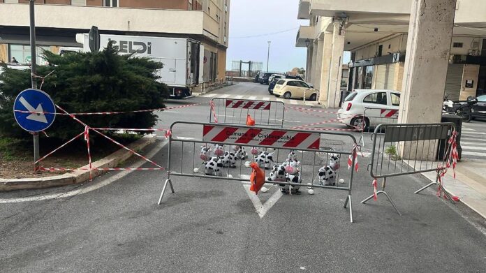 Civitavecchia, sul Corso Marconi spunta un “pascolo” tra le transenne: mucche di plastica per denunciare i cantieri fermi