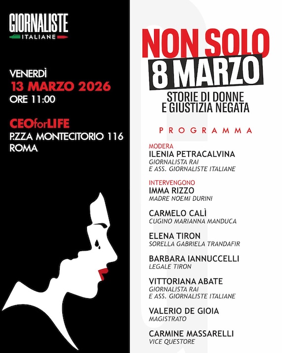 Si terrà venerdì 13 marzo alle ore 11, presso CEOforLIFE (Piazza Montecitorio 116, Roma), l’incontro “Non solo 8 marzo – Storie di donne e giustizia negata”, promosso dall’Associazione Giornaliste Italiane. L’iniziativa nasce con l’obiettivo di mantenere alta l’attenzione sui casi di violenza contro le donne e sulle situazioni in cui le vittime e le loro famiglie si sono trovate di fronte a percorsi di giustizia difficili o incompleti.