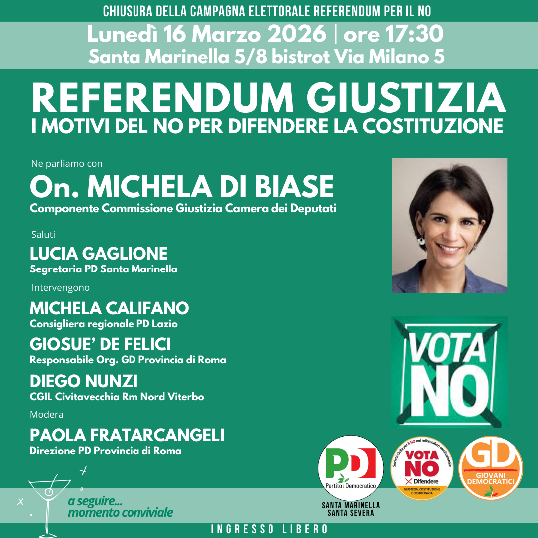 Dopo mesi di iniziative e mobilitazioni sul territorio, il Partito Democratico di Santa Marinella e Santa Severa conclude la propria campagna referendaria con un appuntamento pubblico dedicato ai temi della giustizia e della difesa della Costituzione.L’incontro si terrà lunedì 16 marzo alle 17.30 presso il 5/8 Bistrot e  rappresenterà l’evento conclusivo di un percorso portato avanti insieme al Comitato del No di Santa Marinella e Santa Severa. L’appuntamento, dal titolo “I motivi del NO per difendere la Costituzione”, vedrà la partecipazione dell’onorevole Michela Di Biase, componente della  Commissione Giustizia della Camera dei Deputati, che illustrerà le ragioni del fronte contrario alla riforma oggetto del referendum.Secondo il Partito Democratico, la proposta di riforma rischierebbe di incidere sull’equilibrio del sistema giudiziario, mettendo in discussione l’indipendenza  della magistratura e l’efficienza dei tribunali. Temi che saranno al centro dell’incontro, pensato come momento di confronto con cittadini e simpatizzanti prima della chiusura ufficiale della campagna. L’iniziativa arriva al termine di una serie di attività svolte nei mesi scorsi tra Santa Marinella e Santa Severa, tra incontri pubblici, momenti informativi e iniziative di sensibilizzazione promosse dal partito insieme ai comitati locali. L’obiettivo, spiegano gli organizzatori, è stato quello di coinvolgere la cittadinanza e promuovere un dibattito sui contenuti della riforma e sulle possibili conseguenze per il sistema giudiziario italiano.