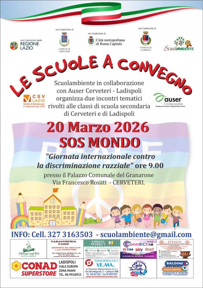 Una mattinata di riflessione, dialogo e sensibilizzazione dedicata ai più giovani. Si è svolto oggi, venerdì 20 marzo, presso il Palazzo del Granarone di Cerveteri il convegno “SOS Mondo – Giornata internazionale contro la discriminazione razziale”, iniziativa rivolta agli studenti per promuovere la cultura dei diritti umani e il contrasto a ogni forma di razzismo. L’appuntamento, iniziato alle 9 è stato promosso dall’associazione Scuolambiente in collaborazione con Auser Cerveteri–Ladispoli e ha ottenuto il patrocinio della Regione Lazio, della Città Metropolitana di Roma Capitale e dei Comuni di Cerveteri e Ladispoli, con il sostegno del CSV Lazio. Protagonisti dell’incontro sono stati gli studenti delle scuole secondarie dell’Istituto Comprensivo Giovanni Cena e dell’Istituto Enrico Mattei, coinvolti in un percorso di approfondimento sui temi dell’inclusione, della solidarietà e del rispetto delle diversità. Nel corso del convegno sono stati affrontati diversi aspetti legati alla discriminazione razziale, con interventi e momenti di confronto pensati per stimolare la partecipazione attiva dei ragazzi e favorire una maggiore consapevolezza sulle dinamiche sociali e culturali che ancora oggi alimentano fenomeni di esclusione e intolleranza. L’iniziativa si inserisce nel quadro delle attività promosse a livello internazionale in occasione della Giornata internazionale per l’eliminazione della discriminazione razziale, ricorrenza che invita istituzioni, scuole e associazioni a promuovere azioni concrete contro il razzismo e a favore di una società più inclusiva e rispettosa dei diritti di tutti. Per gli studenti presenti si è trattato di un’importante occasione di crescita civica e culturale, capace di unire formazione e partecipazione attiva su un tema che riguarda da vicino il presente e il futuro delle nuove generazioni.