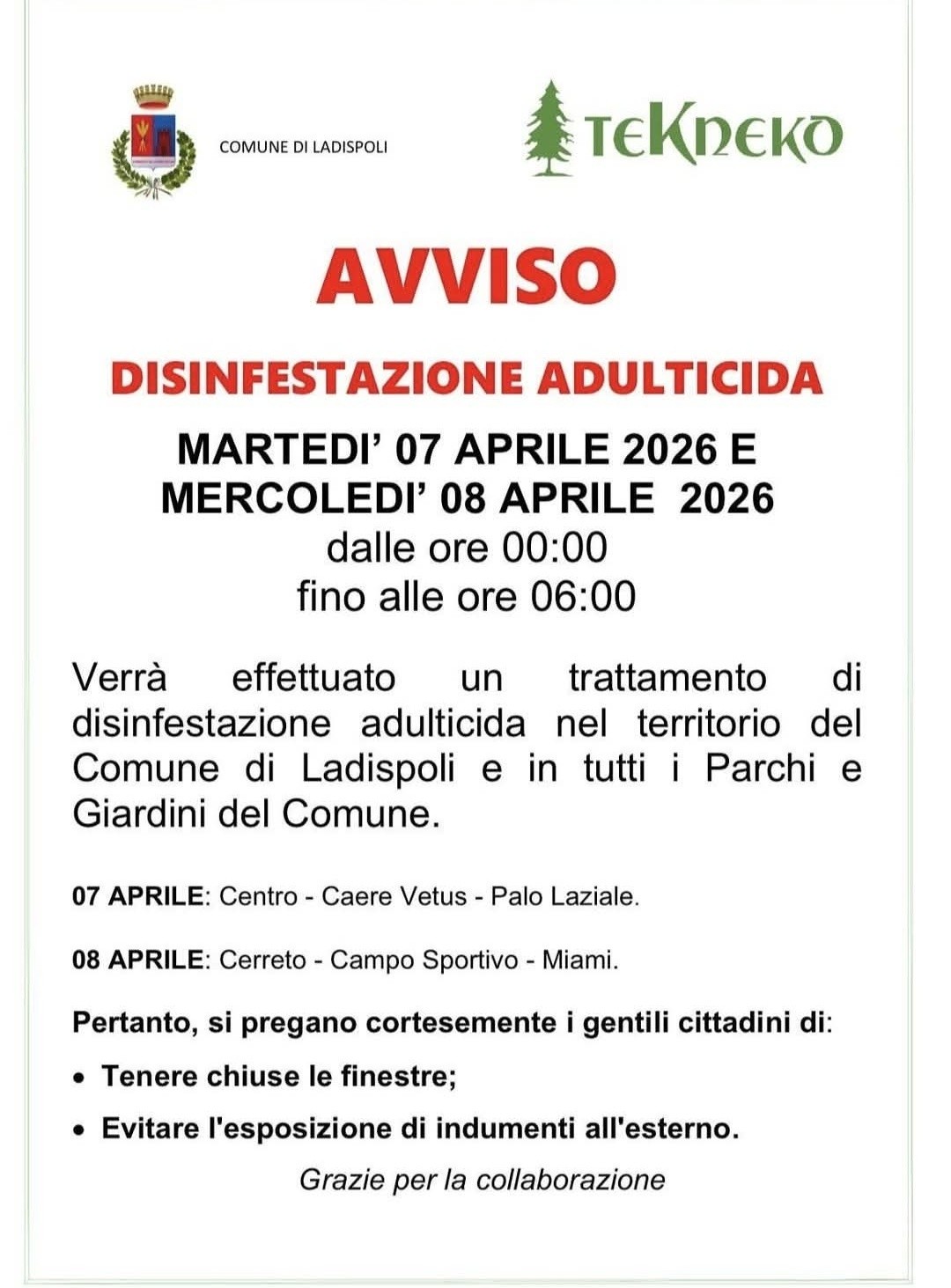 Parte a Ladispoli il piano di disinfestazione adulticida promosso dall’amministrazione comunale per contrastare la proliferazione degli insetti e tutelare la salute pubblica. L’operazione, realizzata in collaborazione con la Tekneko, interesserà l’intero territorio cittadino, comprese le aree verdi, i parchi e i giardini pubblici. L’intervento rientra nel programma stagionale di prevenzione che viene avviato con l’arrivo della primavera, periodo in cui aumenta la presenza di insetti, in particolare zanzare. L’obiettivo dell’iniziativa è duplice: garantire condizioni igienico-sanitarie adeguate e preservare il decoro urbano, soprattutto nelle zone più frequentate da residenti e turisti. Per ridurre al minimo i disagi alla circolazione e alla vita quotidiana dei cittadini, le operazioni saranno eseguite esclusivamente nelle ore notturne, tra la mezzanotte e le sei del mattino. Il territorio comunale è stato suddiviso in due macro-aree operative. La prima fase è in programma martedì 7 aprile, quando i mezzi incaricati effettueranno i trattamenti nelle zone Centro, Caere Vetus e Palo Laziale. Il giorno successivo, mercoledì 8 aprile, la disinfestazione si sposterà nei quartieri Cerreto, Campo Sportivo e Miami, completando così la copertura dell’intero territorio urbano. In occasione degli interventi, il Comune invita la popolazione a seguire alcune precauzioni fondamentali per garantire l’efficacia del trattamento e la sicurezza di persone e animali domestici. Durante le ore di irrorazione dei prodotti è consigliato tenere chiuse porte e finestre delle abitazioni, evitare di lasciare panni stesi, indumenti o generi alimentari all’esterno su balconi e terrazzi e tenere gli animali domestici all’interno delle abitazioni, ritirando dall’esterno eventuali ciotole per acqua e cibo. L’amministrazione comunale ha ringraziato i cittadini per la collaborazione, sottolineando l’importanza di un comportamento responsabile durante le operazioni. Per ulteriori informazioni e aggiornamenti sul piano di disinfestazione è possibile consultare il sito istituzionale del Comune.