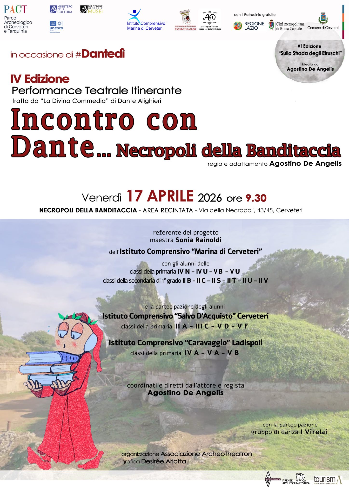 La Necropoli della Banditaccia, patrimonio Unesco e simbolo identitario della città di Cerveteri, si prepara ad accogliere la IV edizione del Dantedì, in programma il prossimo 17 aprile dalle ore 9.00 alle 13.00. Un appuntamento ormai consolidato che unisce cultura, scuola e valorizzazione del patrimonio archeologico attraverso la lettura della “Divina Commedia” di Dante Alighieri. L’iniziativa è ideata dalla maestra Sonia Rainoldi, referente dell’Istituto Comprensivo Marina di Cerveteri, con il sostegno del dirigente scolastico Angela Esposito e l’organizzazione dell’Associazione Culturale ArcheoTheatron, in collaborazione con il Parco Archeologico di Cerveteri e Tarquinia, guidato dal direttore Vincenzo Bellelli, che ha concesso l’utilizzo dell’area monumentale per lo svolgimento dell’evento. Protagonisti della giornata saranno circa 300 alunni provenienti da diversi istituti del territorio: le classi dell’IC Marina di Cerveteri, dell’IC “Salvo D’Acquisto” di Cerveteri e dell’IC “Caravaggio” di Ladispoli. I giovani studenti daranno vita a una lettura animata e itinerante dei canti della “Divina Commedia”, trasformando il percorso archeologico della necropoli in un vero e proprio viaggio letterario. A coordinare e dirigere le attività sarà l’attore e regista Agostino De Angelis, che guiderà le performance degli studenti lungo il tracciato storico del sito. La manifestazione sarà arricchita anche dalla partecipazione del gruppo di danza “I Virelai”, che contribuirà a creare un’atmosfera scenica e immersiva tra teatro, movimento e poesia. Un evento che conferma il legame tra scuola e territorio, e che ogni anno trasforma uno dei luoghi più suggestivi dell’Etruria in un palcoscenico dedicato alla grande letteratura italiana.