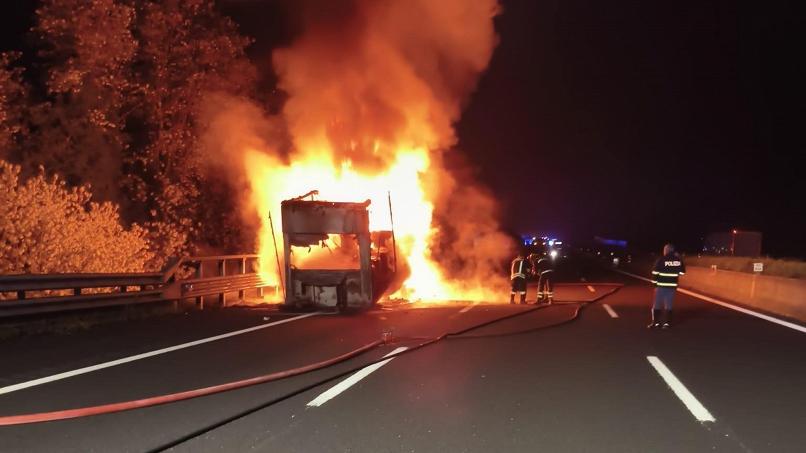Notte di lavoro per i vigili del fuoco di Frosinone, intervenuti per un incendio che ha coinvolto un semirimorchio sulla A1, in direzione Roma, al chilometro 634 tra Ceprano e Frosinone. L’allarme è scattato intorno alle 3:50, quando un autoarticolato che trasportava bobine di plastica per alimenti ha preso fuoco lungo il tratto autostradale. Sul posto sono intervenute le squadre della sede centrale dei vigili del fuoco di Frosinone, con autopompa serbatoio e autobotti, insieme al distaccamento di Fiuggi, con il supporto della società autostradale per la gestione della viabilità e delle operazioni di sicurezza. Le operazioni di spegnimento sono risultate particolarmente complesse e hanno reso necessaria la chiusura dell’autostrada per circa due ore, per consentire l’intervento in sicurezza e la bonifica dell’area. Il trattore stradale è stato sganciato in tempo, evitando che le fiamme si propagassero alla motrice. Il conducente del mezzo è rimasto illeso. L’incendio è stato spento dopo alcune ore di lavoro e l’area è stata messa in sicurezza. Il semirimorchio è stato poi affidato alla società autostradale per la rimozione. Sul posto è intervenuta anche la polizia stradale, per i rilievi e la gestione della viabilità.