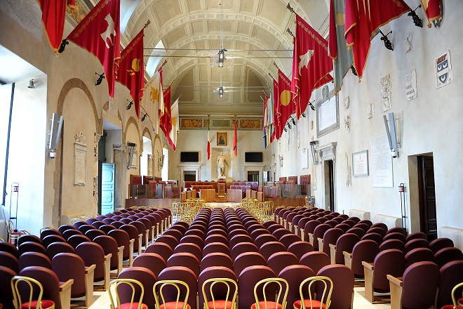 Per molti è semplicemente la sede di rappresentanza del Comune di Roma, Palazzo Senatorio invece vanta una storia millenaria e una complessità di fasi architettoniche che lo rendono un monumento di straordinario interesse archeologico e storico-artistico. L’edificio sorge sulle rovine del Tempio di Veiove, eretto nel 196 a.C., e del Tabularium, grandiosa struttura architettonica costruita nel 78 a.C. per accogliere l’archivio pubblico romano. Intorno alla metà del XII secolo, sui resti di questo edificio (utilizzato prima come fortezza e poi come magazzino del sale) furono ricavati alcuni ambienti del Comune di Roma, nato nel 1143 – 1144 da un moto di ribellione dei cittadini contro Papa Innocenzo II. Qui si riunirono i primi Senatori. Nel corso del Duecento la carica di Senatore fu affidata a due rappresentanti scelti tra i membri delle famiglie baronali romane, poi si giunse al Senatore unico, di nomina pontificia, a cui spettava l’amministrazione della giustizia civile e penale. Il Senatore era coadiuvato da tre magistrati o Conservatori che curavano gli interessi dei cittadini ed ebbero la loro sede nell’edificio a fianco (riedificato nelle forme attuali su progetto di Michelangelo) che prese il nome di Palazzo dei Conservatori e, nel 1471, divenne la sede dei Musei Capitolini, il museo pubblico più antico del mondo. Nel corso del Trecento, Palazzo Senatorio cominciò a chiudersi come una fortezza, molte delle arcate dei loggiati furono tamponate, mentre Papa Bonifacio IX fece costruire due torri-contrafforte, ancora oggi visibili sul fianco destro del Palazzo. Da una finestra tra le due torri si affacciava il Senatore per assistere alle esecuzioni che avevano luogo anche sull’altura di Monte Caprino. Nel Quattrocento si aggiunsero la torre-contrafforte di Martino V sulla sinistra e quella di Niccolò V, verso il Foro. A metà del Cinquecento, Paolo III Farnese decise di trasformare completamente lo spazio architettonico e simbolico del Campidoglio, affidando a Michelangelo, suo architetto, scultore e pittore di fiducia, l’incarico della nuova definizione della piazza e degli edifici preesistenti. Il progetto, però, fu solo in parte realizzato sotto la sua supervisione: gli interventi da lui diretti riguardano il trasferimento, nel 1538, della grande statua bronzea del Marco Aurelio dal Laterano al centro della futura piazza, alla quale si accedeva attraverso una grandiosa cordonata progettata dal Buonarroti e realizzata a partire dal 1561. Domina il palazzo la torre campanaria, alta 35 metri ed eretta su progetto di Martino Longhi il Vecchio tra il 1578 e il 1582 in sostituzione della torre medievale, colpita da un fulmine nel 1577. Sulla torre sono collocate due campane, la maggiore, fusa nel 1803, pesa circa 6.000 chili; la minore, fusa nel 1804, pesa circa la metà. Entrambe furono benedette alla presenza del Pontefice Pio VII, nel 1805. La Sala del Carroccio, ricavata nel 1779, prende il nome dall’iscrizione in caratteri gotici realizzata in memoria dell’invio ai romani, come trofeo di guerra e monito, dei resti del Carroccio strappato da Federico II di Svevia ai milanesi nella battaglia di Cortenuova (1237). Questo il testo: “O Roma ricevi quale dono di Federico II Cesare Augusto il carro, ornamento augurale per la città. Questo, preso dalla strage di Milano, viene come preda illustre per riferire il trionfo di Cesare. Rimarrà ad obbrobrio del nemico; è inviato in onore della città di Roma. L’amore per lei impose di mandarlo”. Nella Sala sono conservati alle pareti rari frammenti marmorei di arredi altomedioevali, provenienti dalla chiesa di Santa Maria in Capitolio, primo nucleo della futura chiesa dell’Aracoeli. Dagli ambienti della Galleria di Sisto IV invece si possono osservare dall’alto i resti del Tempio di Veiove, scoperti nel 1938-1940. Al suo interno è stata rinvenuta la statua marmorea di culto della divinità (oggi esposta nella galleria di congiunzione del Tabularium) e l’ara marmorea. La visuale dall’alto permette di percepire chiaramente la pianta del tempio. Attraversato uno stretto corridoio e oltrepassata la Sala del Boia, dove sostavano i condannati a morte prima dell’esecuzione, si sale al primo piano nell’Aula Consiliare, la sala più grande, denominata Aula Giulio Cesare, da sempre il centro vitale del palazzo e luogo di riunioni dei massimi rappresentati dell’amministrazione cittadina. Lungo le pareti sono state esposte le bandiere dei Rioni di Roma e murati stemmi marmorei e musivi del Trecento e Quattrocento, un tempo collocati sulla facciata del Palazzo. Sui lati brevi si trovano la celebre statua antica di Giulio Cesare e quella di un Navarca romano, raffigurante un capo della flotta militare. Al centro della sala è conservato un mosaico pavimentale con cinque pannelli decorativi, a tessere bianche e nere, databile al II secolo d.C., proveniente da una villa romana. La Giunta Capitolina invece si riunisce tradizionalmente nella Sala delle Bandiere (ricavata in un ambiente della Torre di Martino V) che ospita anche le conferenze stampa del sindaco. Al centro vi è uno storico tavolo in legno intarsiato, realizzato da ebanisti romani nel 1842. Nelle vetrine sono conservate le 14 bandiere della Guardia Civica di Roma del 1847, quelle dei Rioni di Roma e il Gonfalone della città, decorato con la medaglia d’oro al valor militare nel 1949, oltre alla bandiera delle Olimpiadi del 1960 e a quella della Corazzata “Roma”, nella quale fu avvolto il feretro del Re Umberto I. Al primo piano del palazzo si trovano anche il Salotto dell’Orologio, piccola sala di rappresentanza decorata nel 1929 con una fascia di affreschi del pittore Cisterna; la Sala dell’Arazzo che prende il nome dal pregevole arazzo fiammingo di soggetto romano databile alla seconda metà del Cinquecento; lo Studio del Sindaco, ospitato in due stanze contigue: nella prima si trova lo studio vero e proprio, nella seco