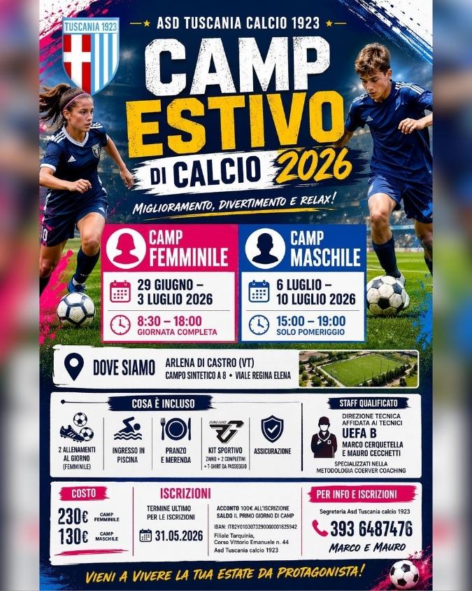 Due appuntamenti in programma ad Arlena di Castro, tra campo sintetico e piscina: il Camp Femminile dal 29 giugno al 3 luglio (formula giornata completa) e il Camp Maschile dal 6 al 10 luglio (formula pomeridiana). Previsti allenamenti quotidiani con staff qualificato UEFA, attività tecniche e momenti dedicati al gruppo e al divertimento.