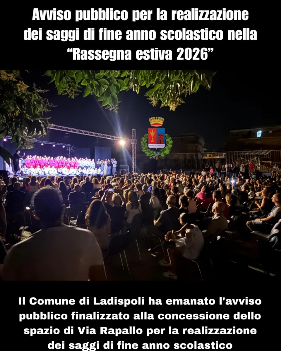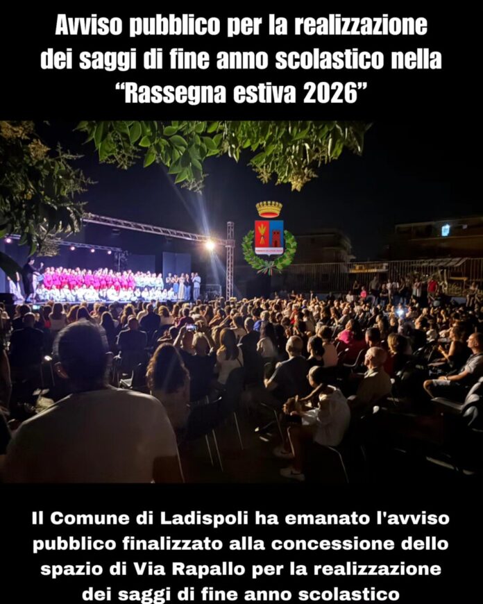 Il Comune di Ladispoli ha emanato un avviso pubblico finalizzato alla concessione dello spazio di via Rapallo, adiacente al sito archeologico La Grottaccia, destinato ad attività culturali e in particolare alla realizzazione dei saggi di fine anno scolastico inseriti nel programma della “Rassegna estiva 2026”, iniziativa che punta a valorizzare il territorio e offrire occasioni di partecipazione alla cittadinanza; il periodo di concessione dell’area è compreso tra il 19 giugno e il 23 agosto 2026, mentre le domande dovranno essere presentate entro le ore 12:00 del 30 aprile 2026 tramite consegna a mano al Protocollo comunale in Piazza Falcone oppure inviate via PEC all’indirizzo istituzionale dell’ente, con l’amministrazione che invita associazioni, scuole e realtà culturali del territorio a partecipare per contribuire alla realizzazione di un calendario estivo ricco di eventi e iniziative; tutta la documentazione, comprensiva dell’avviso pubblico, della determinazione dirigenziale e del modulo di richiesta, è disponibile sul sito ufficiale del Comune.